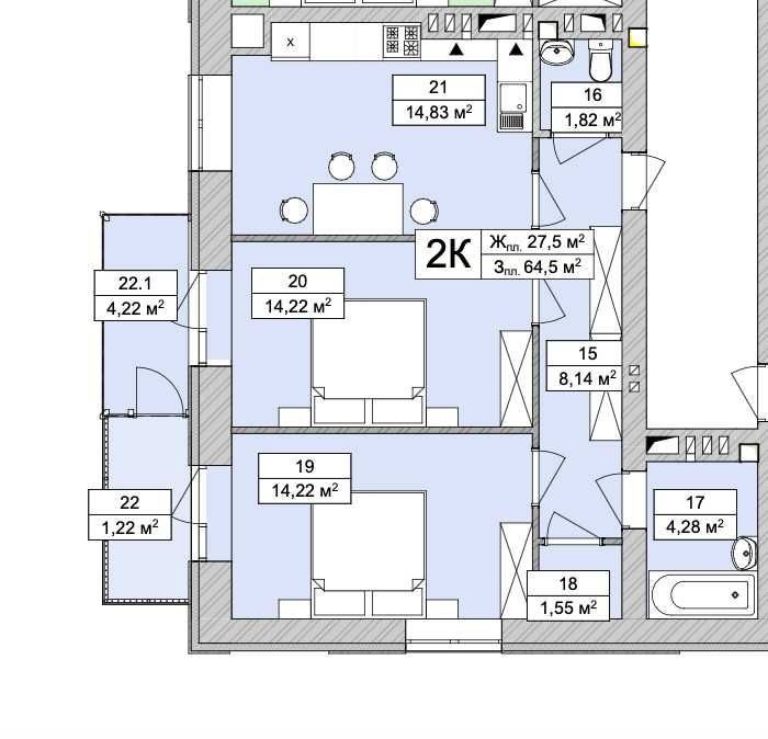 • Площадь кухни 15 м2