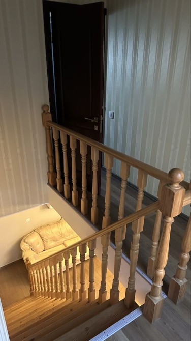 Кухня столовая на первом этаже и две раздельные спальни на втором этаже.