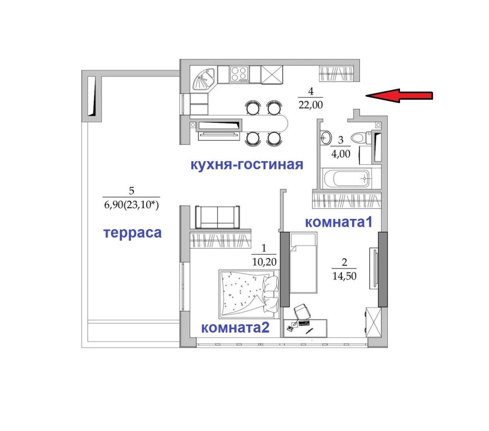 • Площадь кухни 22 м2
