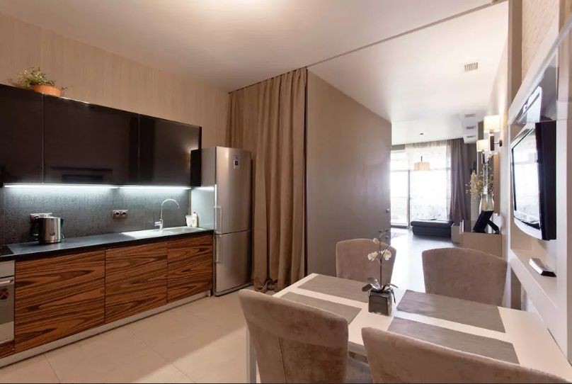 Квартира состоит из просторной кухни студии и спальни, современный стильный ремонт, дорогая мебель, хорошая техника, все удобства, в санузле джакузи и душевая, теплые полы. В доме охраняемая территория, консьерж, платная стоянка на территория дома, есть паркинг. Дом находиться прямо над морем в Аркадии, 2 минуты пешком. Множество развлекательных заведений, магазинов, супермаркетов.