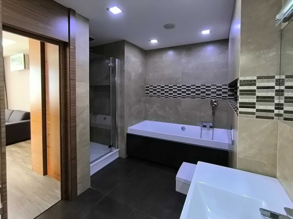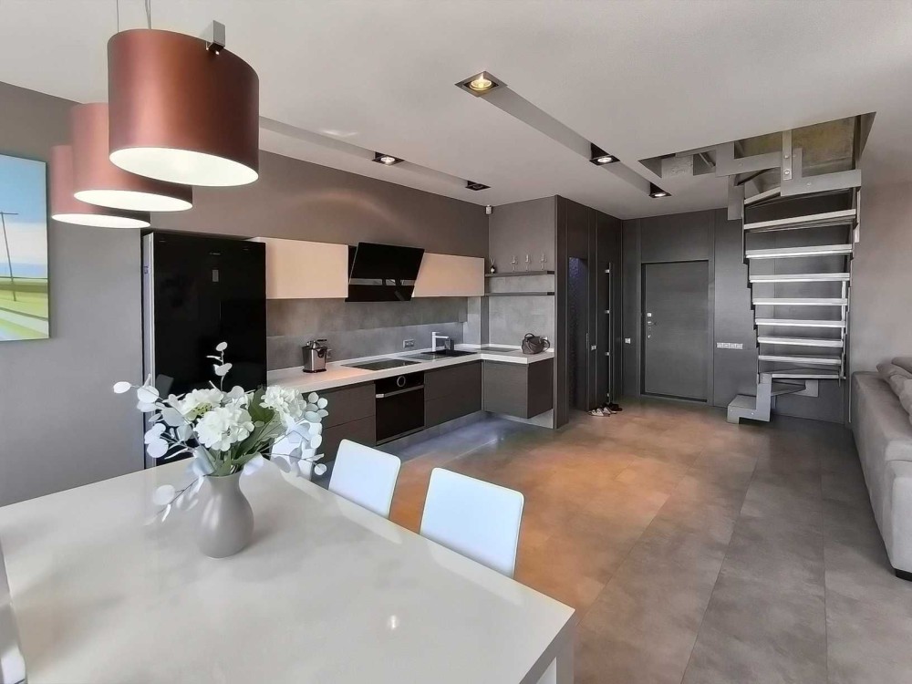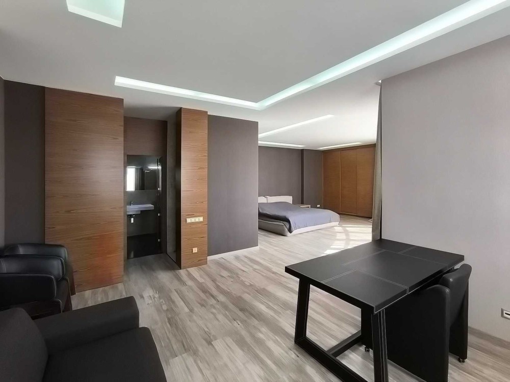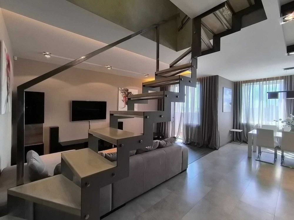Второй уровень: большая комната 45 кв.м, зонально разделена на кабинет и просторную спальню, санузел - ванная и душевая кабина 9 кв.м и просторная терраса, с великолепным видом на старый город.