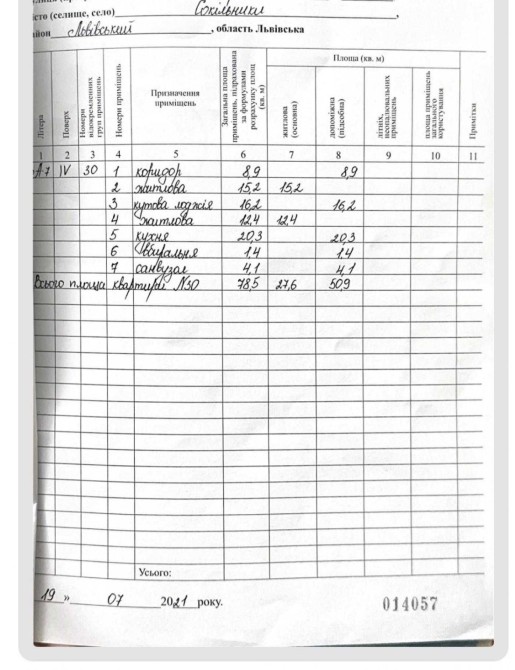 Загальна площа — 78.5 м², житлова — 27.6 м², кухня — 20.3 м².
