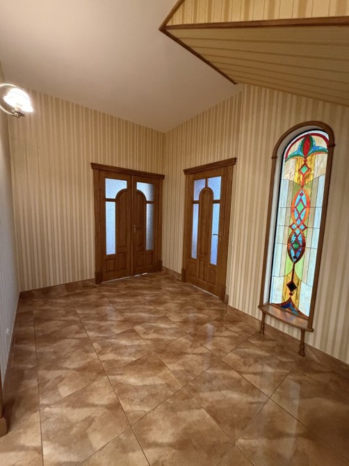 Усі елементи інтер’єру — індивідуальної роботи: вітражі, створені майстрами на замовлення, натуральне дерево, паркет і сходи, та рідкісний зелений мармур для діючого каміну, який видобувається лише в одному місці у світі.