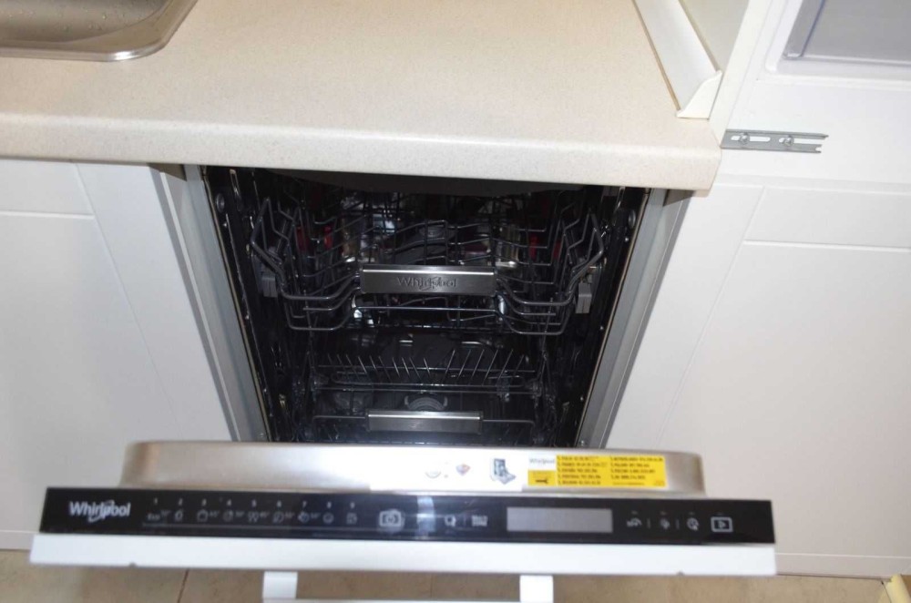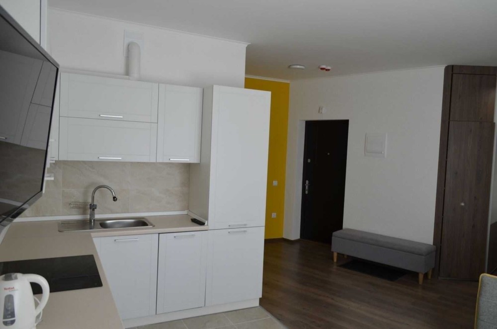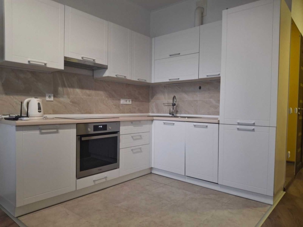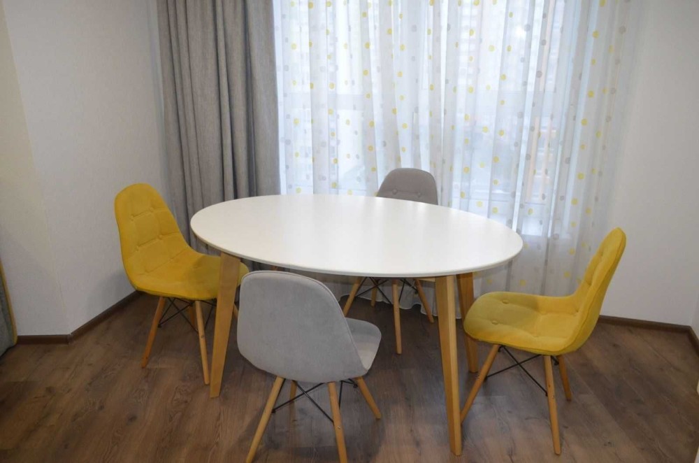 Вбудована кутова кухня з варильною поверхнею Schott Ceran, горизонтальною витяжкою Elica, посудомийною машиною, вбудованою духовою шафою та 2х камерним холодильником Whirlpool, телевізор LCD Toshiba 32’, кондиціонер Kentatsu, компактний розкладний диван, стіл кухонний, м'які стільці, в робочій зоні кухні на підлозі плитка для підлоги.