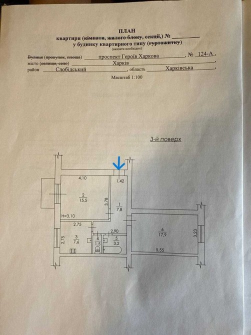 Загальна площа 54,2 кв. м., житлова 33,4 кв. м., кімнати роздільні (15,5+ 17,9), кухня 7,6 кв.м., висота стелі 3,10 м.