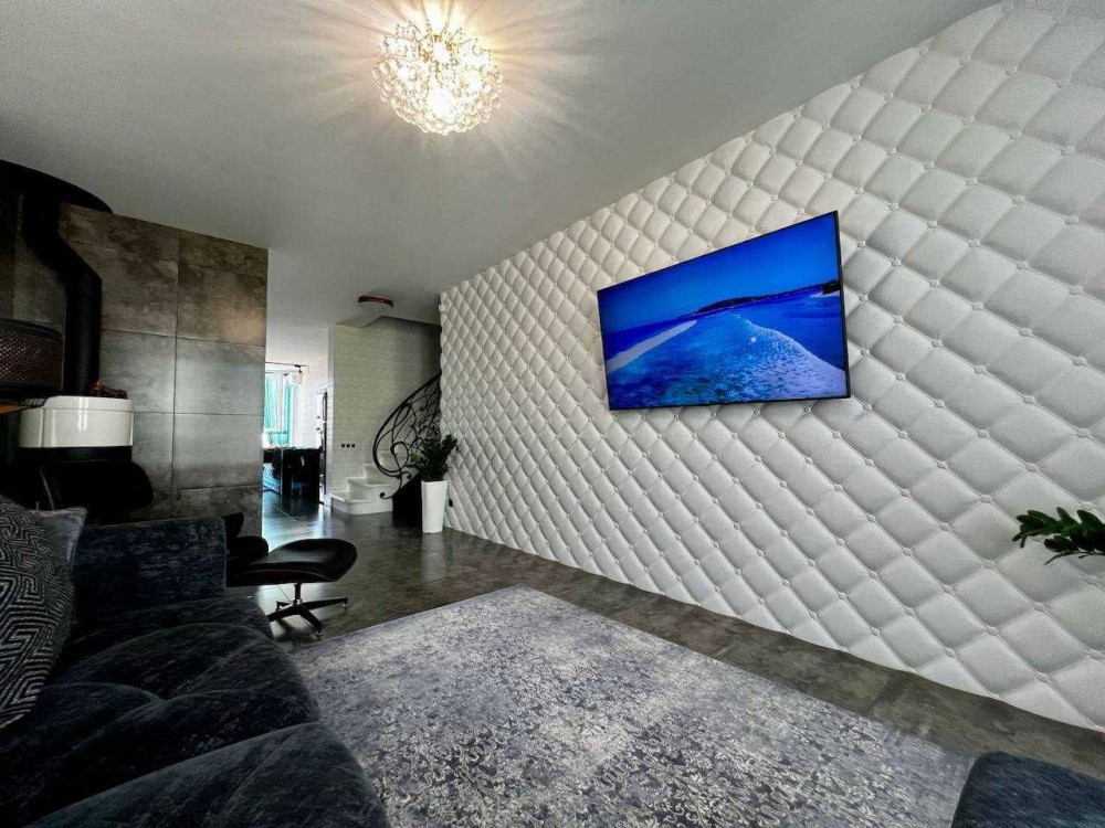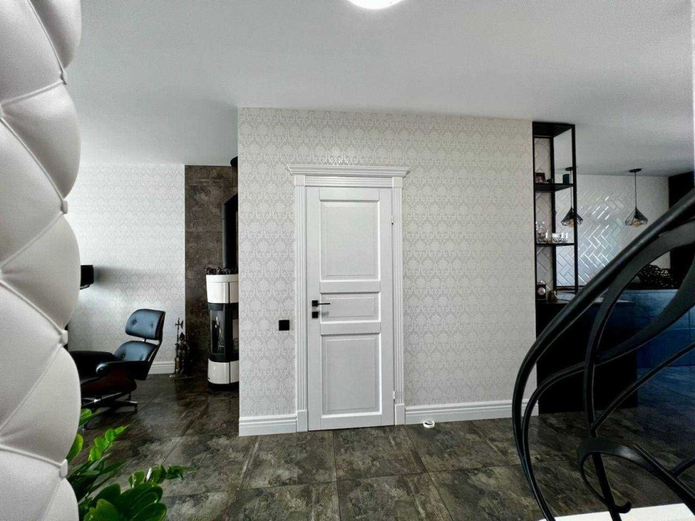 Вас приймає вітальня з дров'яним каміном, де просторо та світло, а інтер'єр створює атмосферу розкоші та затишку одночасно.
