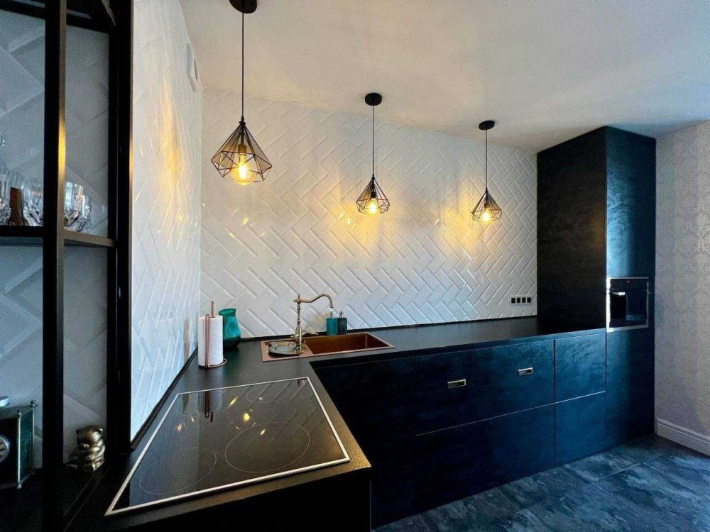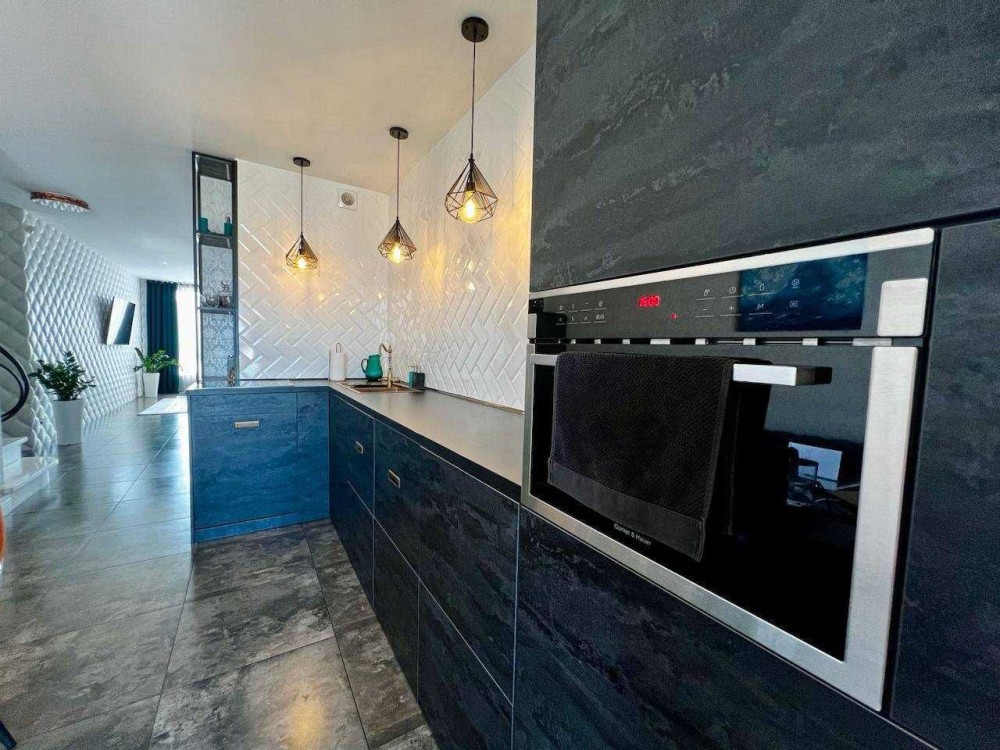 Простора кухня стала справжнім шедевром сучасного дизайну, де ви зможете проявити свою кулінарну майстерність або просто насолодитися сніданком зі сходом сонця та красивим видом з панорамного вікна.