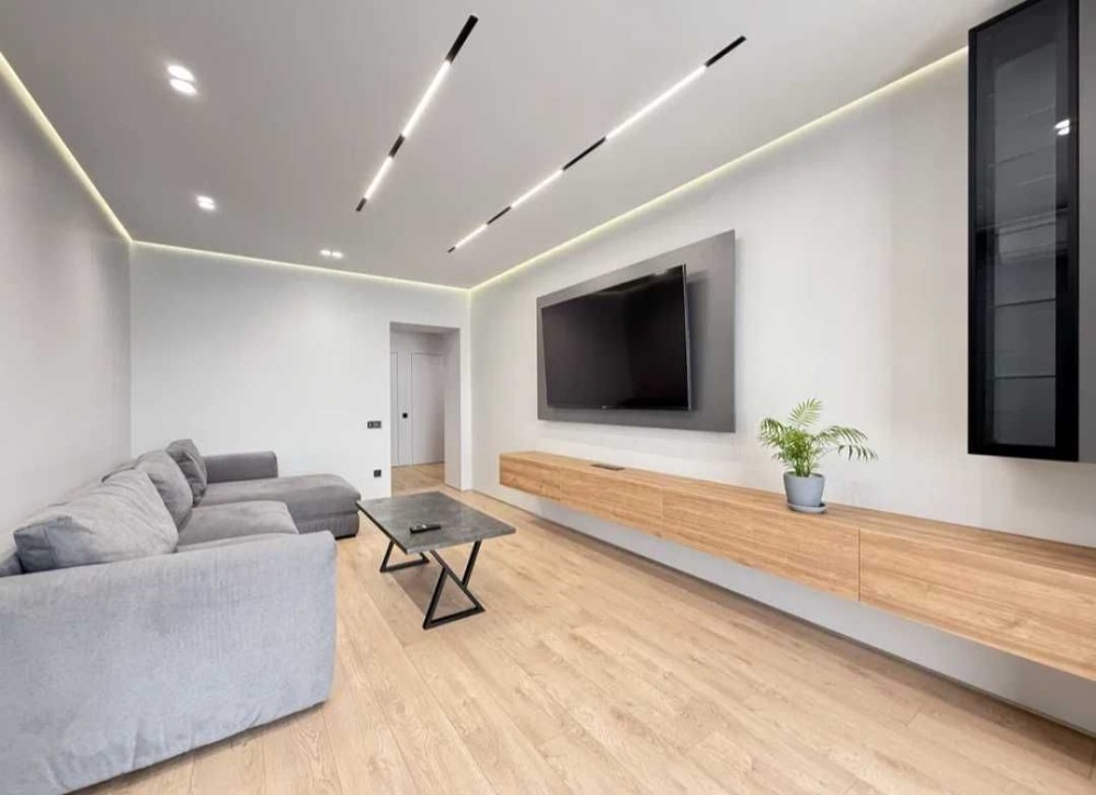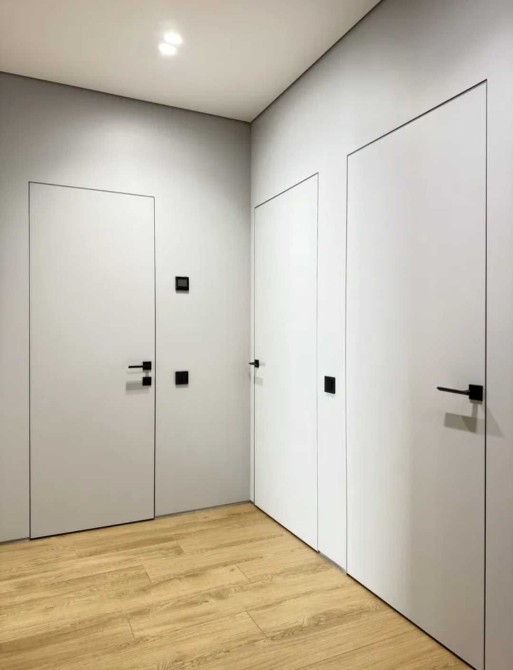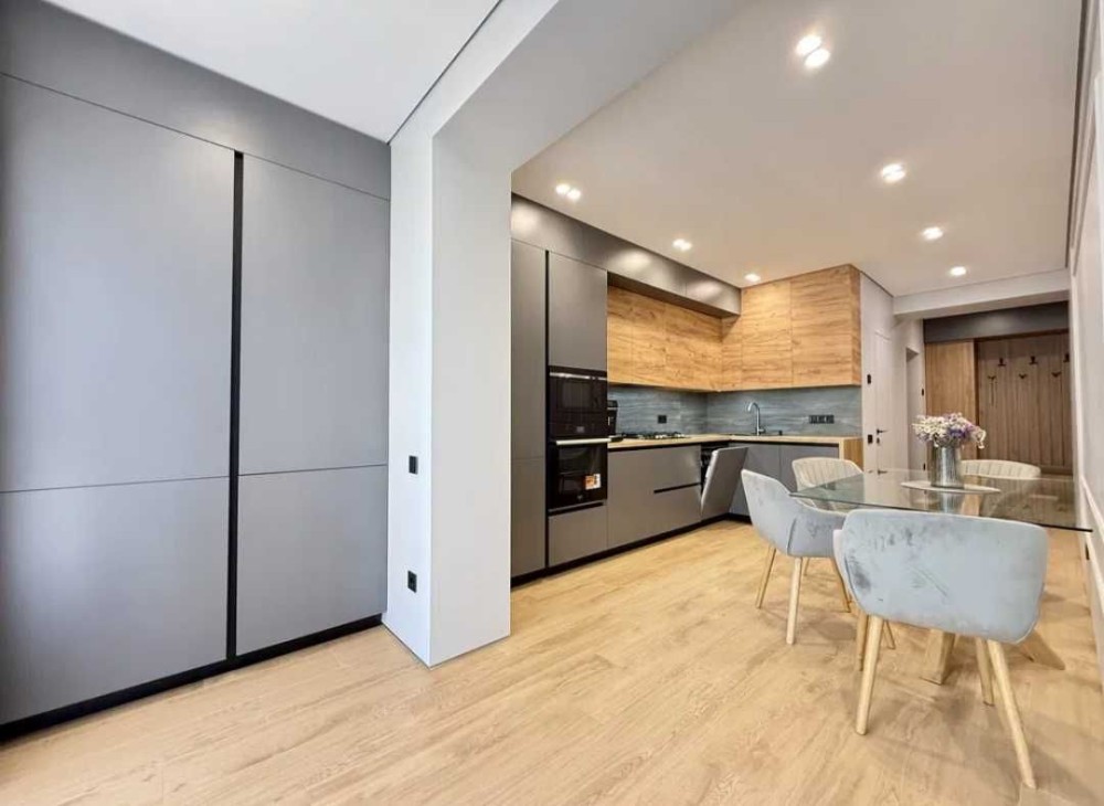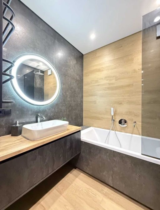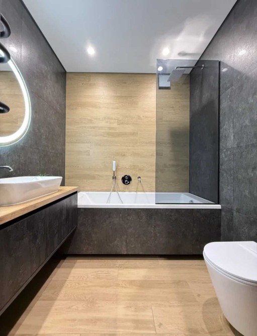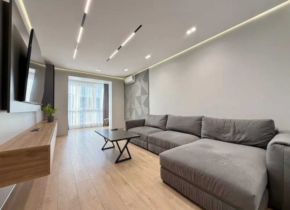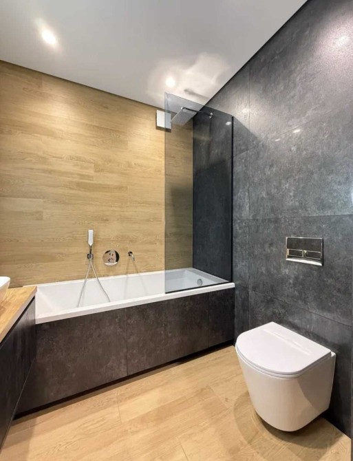 Ремонт виконаний з якісних матеріалів, в сучасному стилі: двері прихованого монтажу, стеля - з гіпсокартону, тіньовий профіль примикання, прихований плінтус, якісна сантехніка, два підвісні унітази, ванна із вбудованими змішувачами, скляна душова перегородка, тропічний душ.