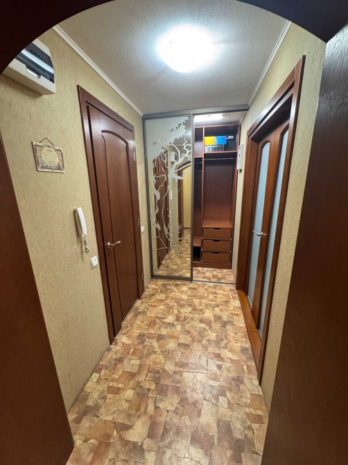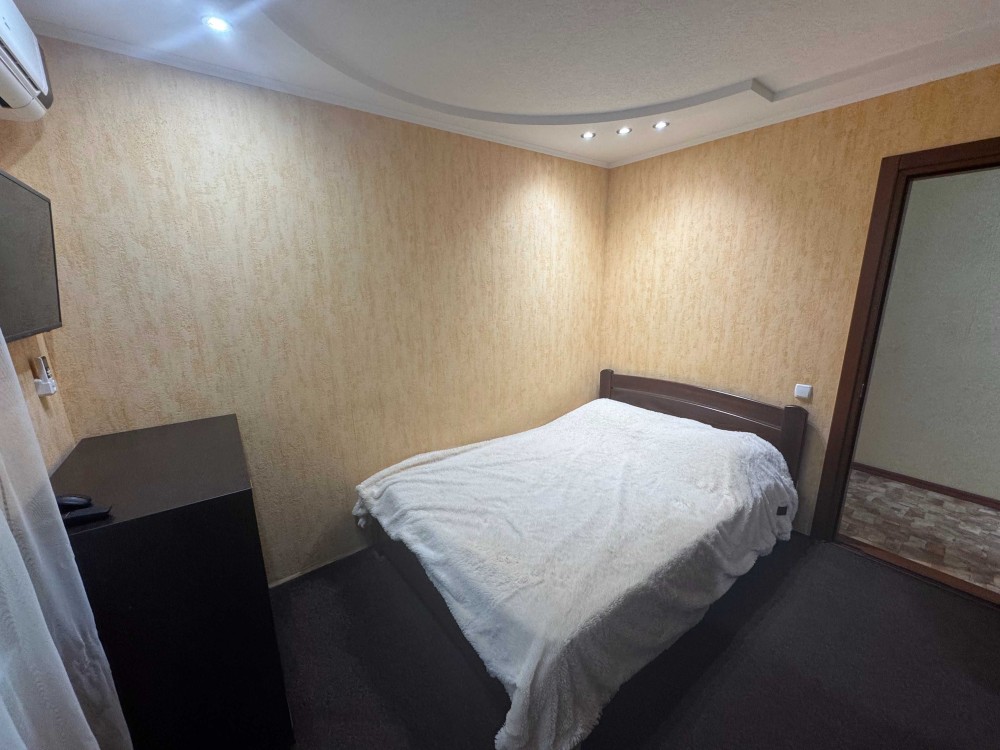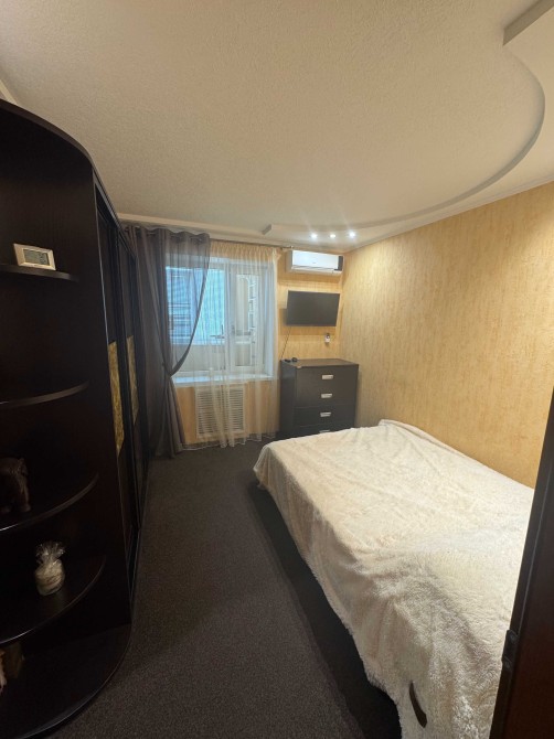 Пластикові вікна, кондиціонер. У одній кімнаті шкаф, стіл, ліжко. У іншій кімнаті шкаф-купе, двомісне ліжко, комод. Кухня з меблями, стіл, стільці, холодильник. Бойлер у вбиральні. У коридорі шкаф-купе. ОСББ.