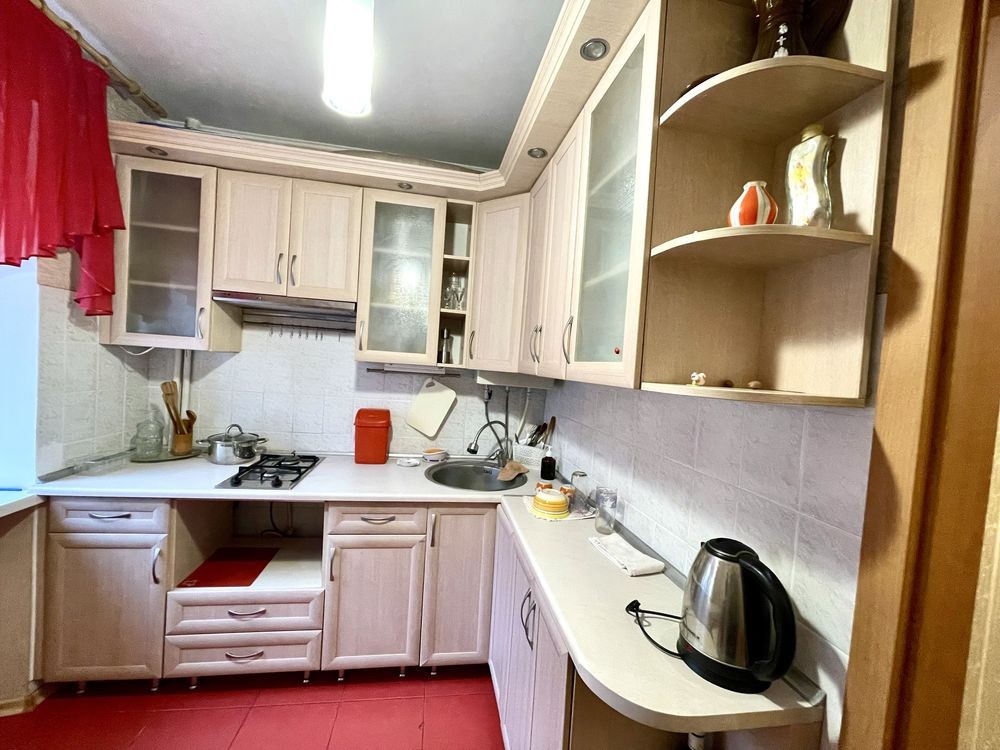 На кухні велика вбудована кутова кухня. Санвузол обʼєднанний в плитці.