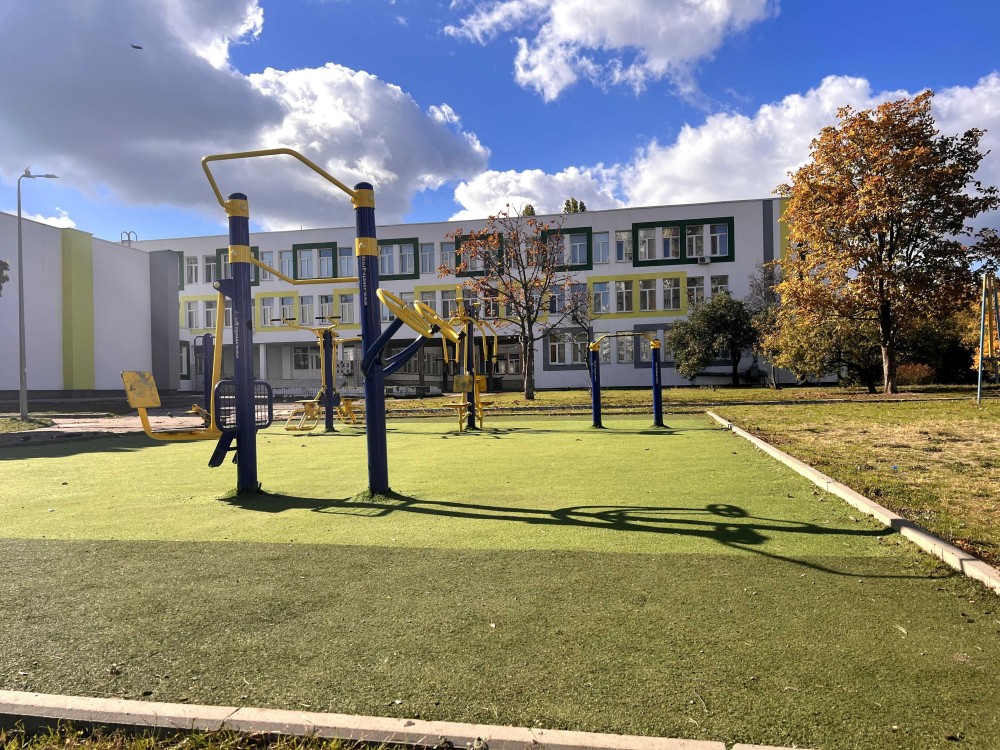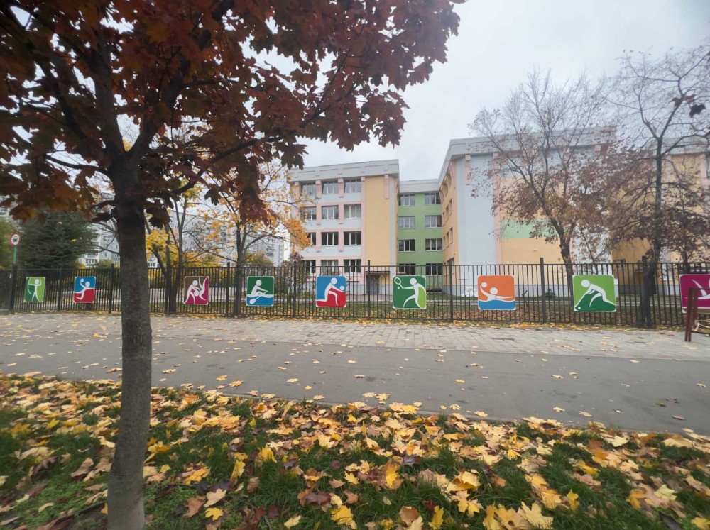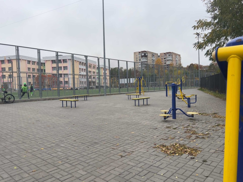 в один бік через двір — спортивна школа, у другий — школа-гімназія.
