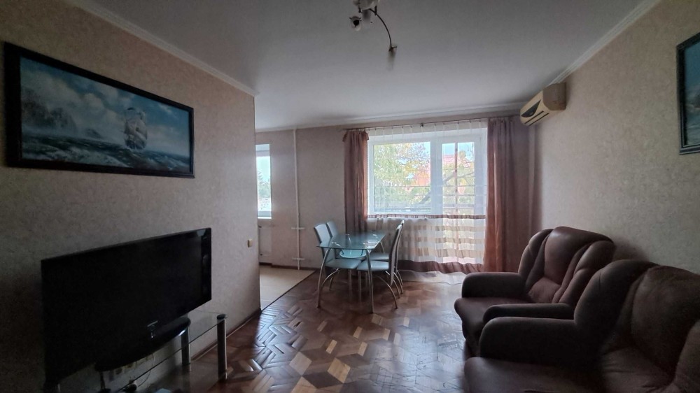 Кирпичный дом, квартира двухсторонняя, комфортный этаж. Удобная планировка: кухня-гостиная 23м, отдельные 2 спальни. В доме собственная котельная. Квартира с паркетом, есть балкон, есть кондиционер. Установлена колонка для горячей воды. Морская сторона — свежий воздух и приятный климат. Есть возможность проводить время возле моря.