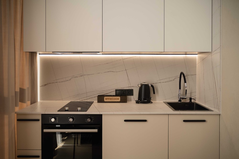 Студія розрахована на перебування до 2-х осіб. У квартирі: WI-FI, ТБ, кондиціонер, ванна, свіжі рушники, фен, праска, завжди гаряча вода. Двоспальне ліжко з ортопедичним матрацом. Сучасна кухня (необхідний посуд + техніка) та пральна машина
