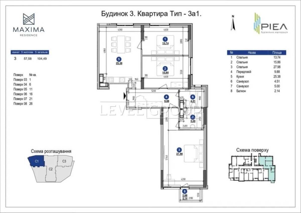 Загальна площа 104. 9м2, жила 57. 91м2, кухня 27м2.