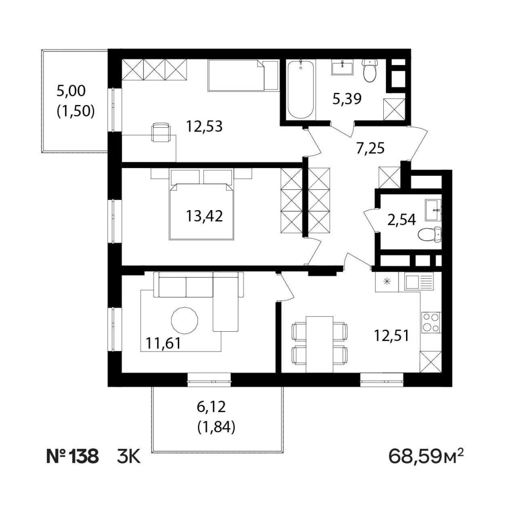 • Общая площадь 68.59 м2
