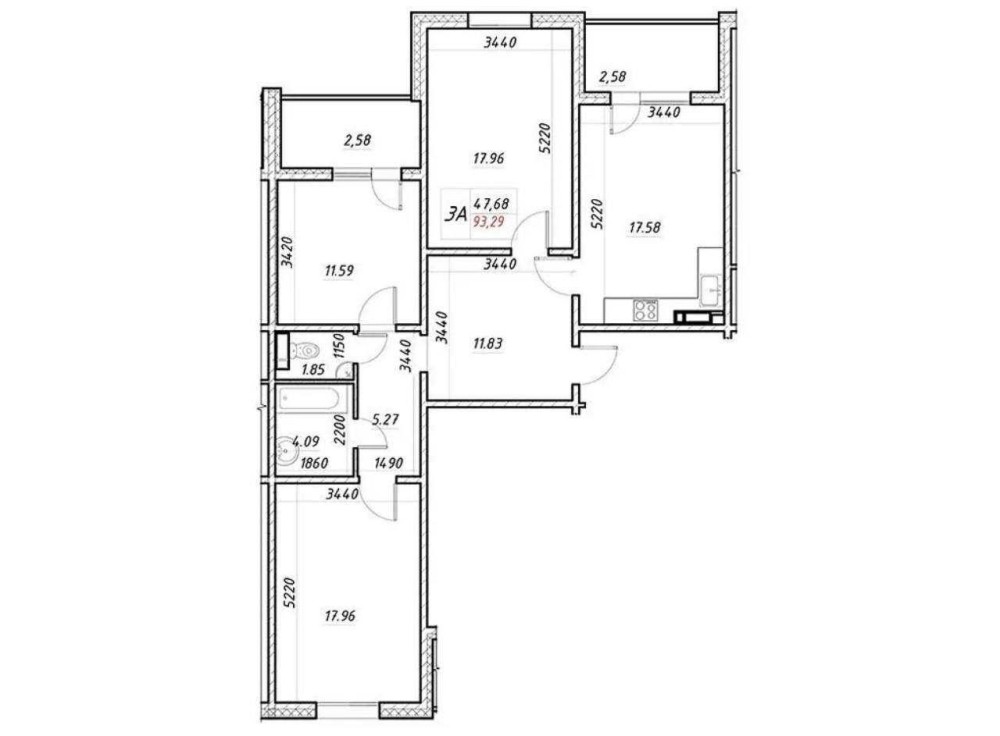 Три окремі кімнати по 17м2, великий хол-вітальня, кухня 11 м2. Дві лоджії ( одна на кухні, друга в спальні). Роздільний санвузол.