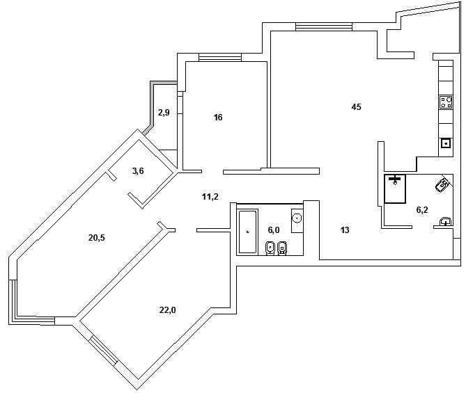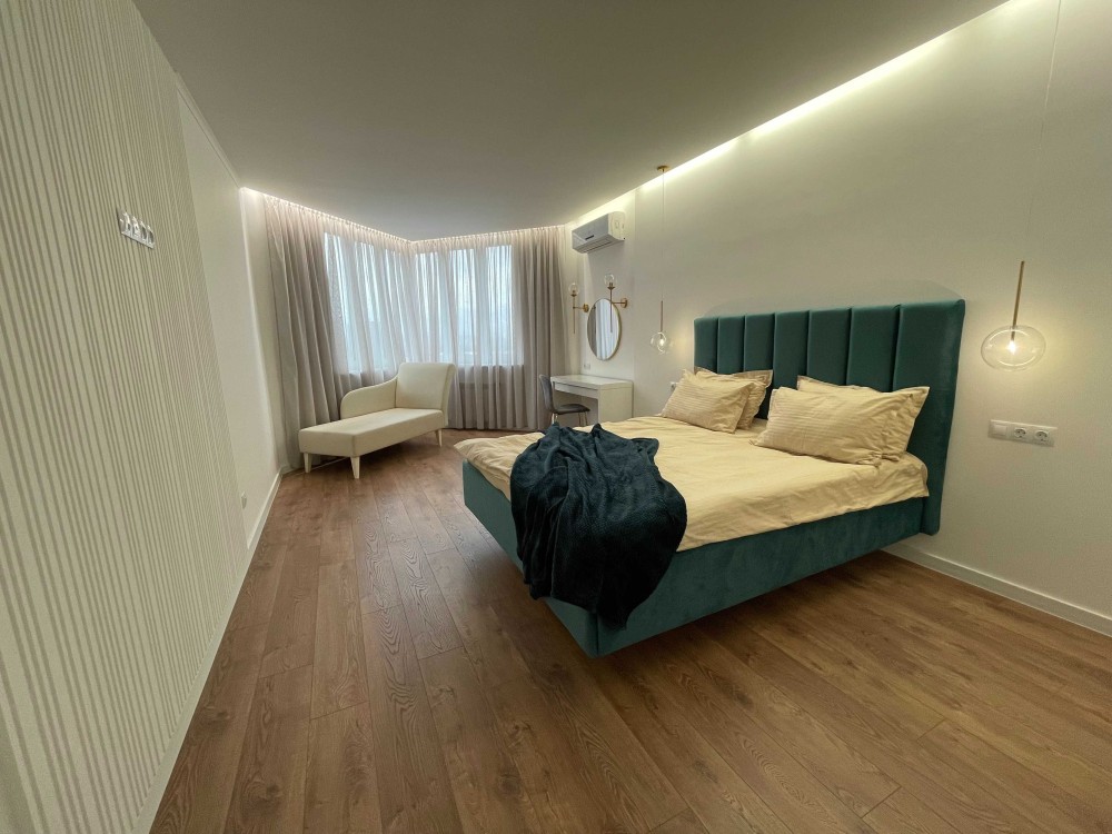 В квартирі: 3 окремі кімнати; простора кухня-вітальня 45 кв.м., гардеробна, 2 санвузли (душова та вана).