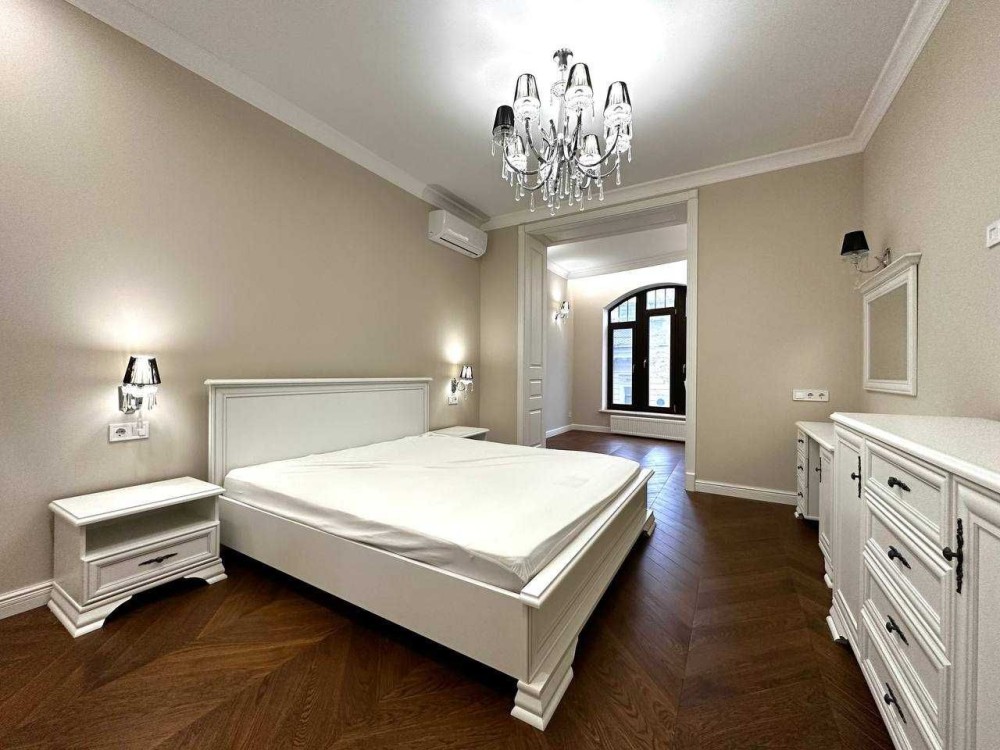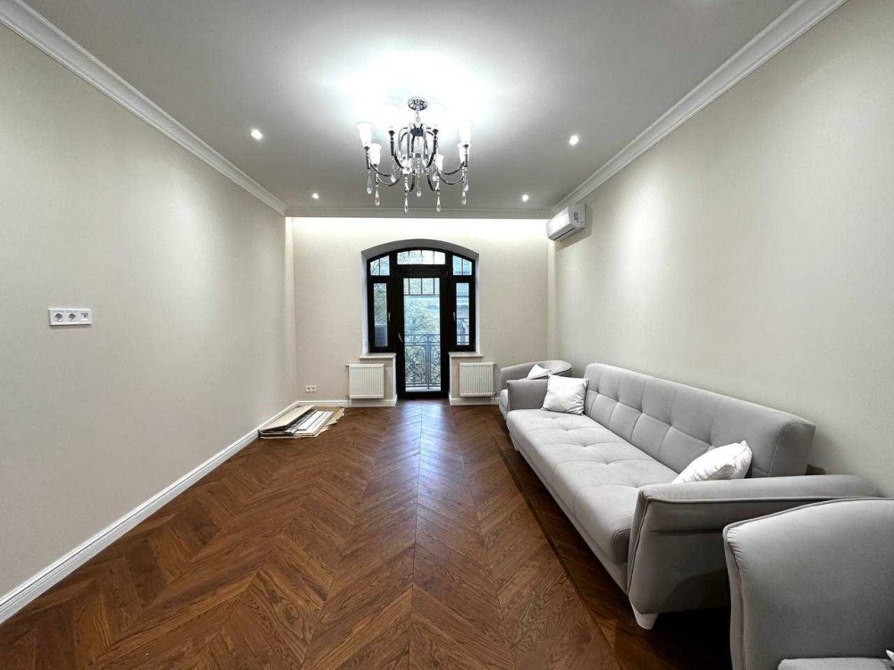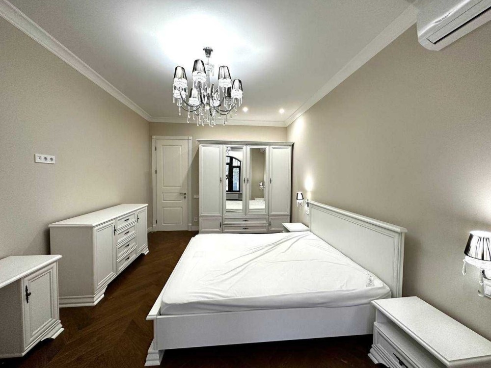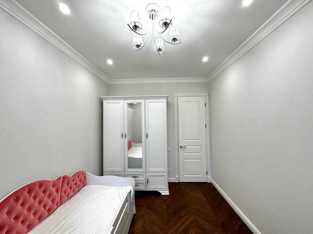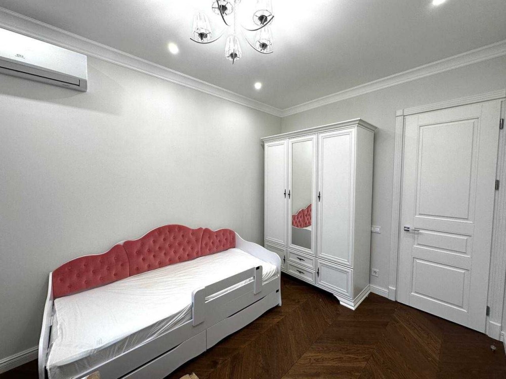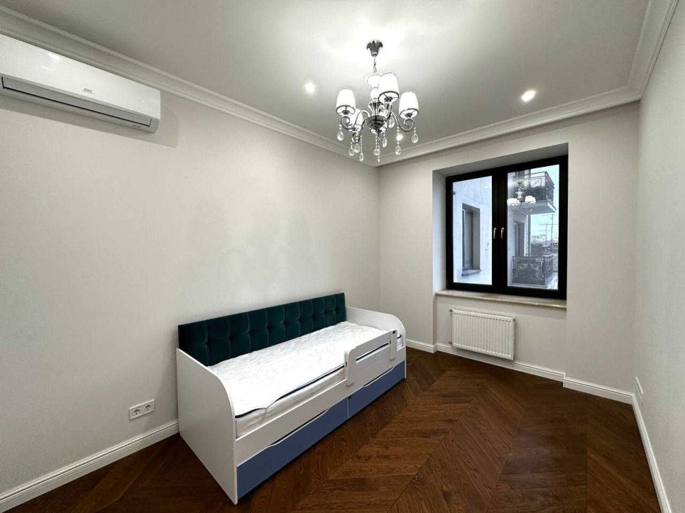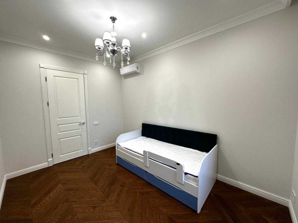 Новый ремонт, никто не жил. Мраморные подоконники , натуральный паркет, деревянные двери. Четыре отдельных комнаты: спальня, гостиная, две детские, кухня 20 кв.м, два с/у. Средний этаж. В квартире индивидуальное отопление.
