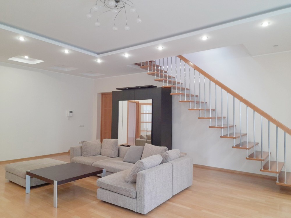 Загальна площа 308,3 м кв. Класичний ремонт з дорогих якісних матеріалів. На першому рівні вітальня площею 56,1 м кв з виходом на балкон, кухня 19,6 м кв, дві кімнати 33,9 і 28,7 м кв. Також ванна кімната 8,7 м кв і туалет 3,1 м кв.