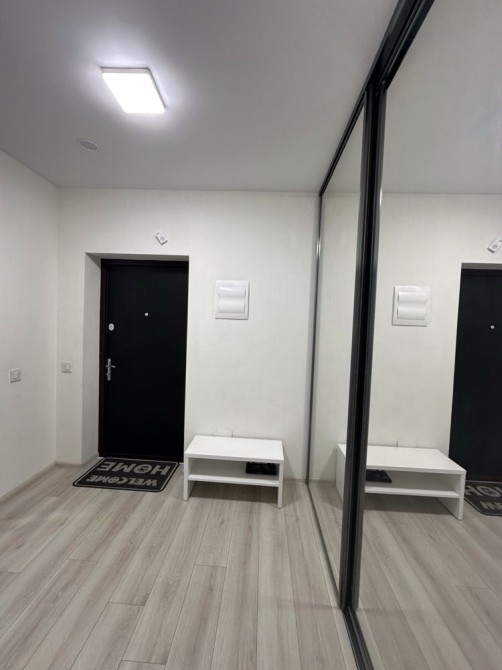 - Великий передпокій розділений дзеркальними дверима-купе з гардеробною, яка має вільне планування і дає змогу зберігати великі речі.