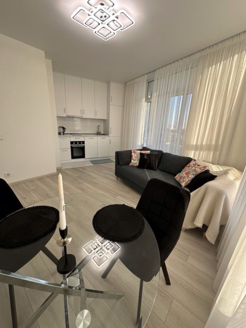 - Кухня-вітальня має зручну кухню на замовлення з вбудованим холодильником і посудомийною машиною, якісну побутову техніку, кондиціонер, розкладний диван Blest та стильний скляний стіл зі стільцями.