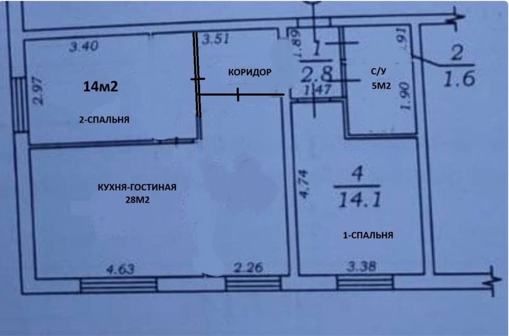 3 комнатная квартира перепланирована в двухкомнатную и большую кухня-гостиную 28м2