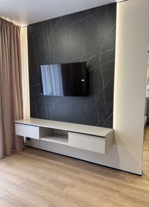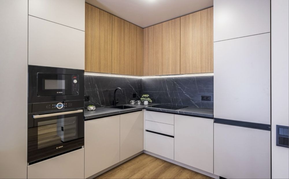 Бронированная входная дверь Напольное покрытие по всей квартире из кварцвинила(Германия) декоративная штукатурка с восковым моющимся покрытием Итальянская кухня с встроенной техникой