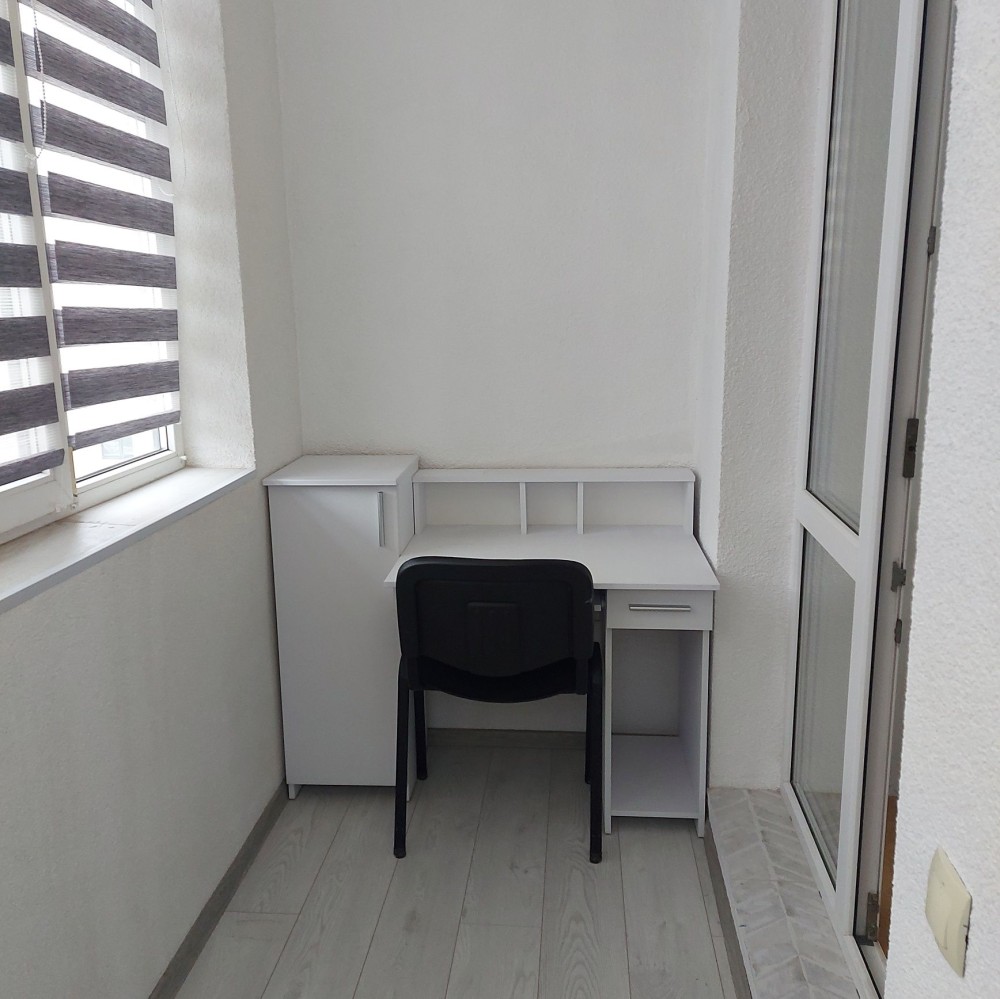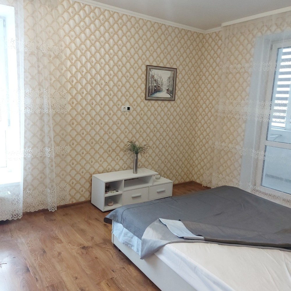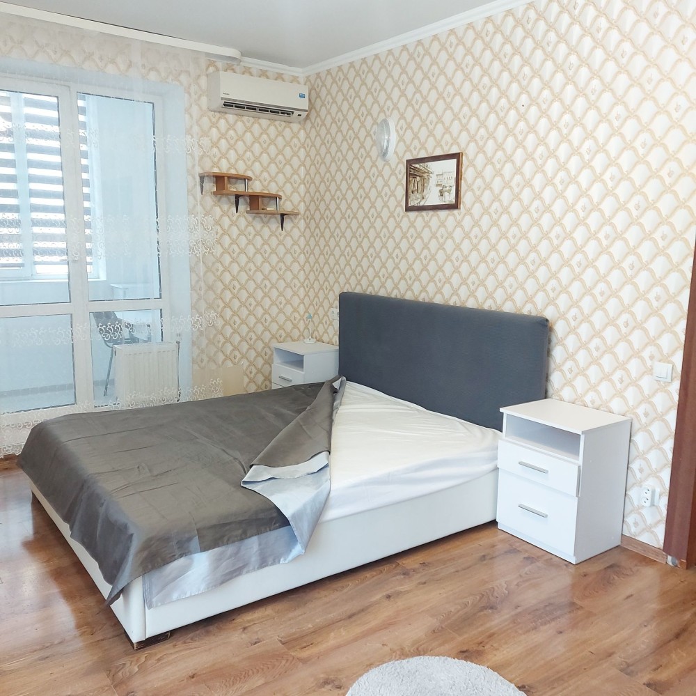 Спальна кімната з великим двоспальним ліжком з ортопедичним матрацом та великою шафою-купе. Доповнює комод, тумба під телевізор та 2 приліжкові тумбочки. На балконі вікна-жалюзі, письмовий стіл.