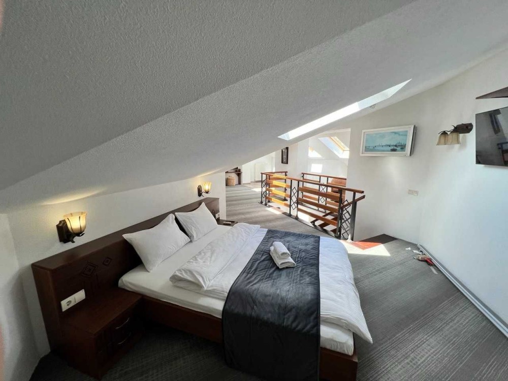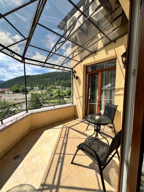 Пропонуємо вашій увазі готель "Friend’s House", який знаходиться у Поляниці (урочище Стаїще). Він складається з двох будинків. По праву сторону розташований перший будинок, побудований у 2007 році, та по ліву сторону - другий, збудований у 2018 році. Земельна ділянка становить 0.054 га. Другий будинок має чотири повноцінних поверхи та п'ятий мансардних. Загальна площа складає 295 кв. м. Він зведений на бутобетонному фундаменті, з монолітним каркасом, колони якого заповнені керамблоками. Тип перекриття дерев'яні балки. Дах будинку вкритий металочерепицею, та утеплений мін ватою товщиною 20 см. Стіни також утеплені пінопластом товщиною 10 см. Будинок має три входи з металопластиковими дверима. По всьому будинку встановлені двокамерні енергозберігаючі вікна металопластикові. Підлога в житлових кімнатах (номерах) викладена ламінатом, у коридорах, санвузлах та допоміжних приміщеннях - плиткою з підігрівом. Опалення здійснюється твердопаливним котлом на пелетах потужністю 45 кВт (приблизний розхід пелетів - 10 тонн за сезон) та електрокотлом потужністю 12 кВт, який має два режими роботи: 6 кВт і 12 кВт. Також на четвертому поверсі знаходиться комін. Вода подається від резервуара об'ємом 30 тонн, який автоматично наповнюється зі скважини або криниці. Також встановлені фільтри для очищення води. На гарячу воду встановлений бойлер на 500 л. На передньому подвір'ї розташовано автономний біосептик, який обслуговує два будинки. До готелю підведено 15 кВт електроенергії, а також є генератор на 30 кВт для трьох будинків. На першому поверсі, при вході, розташовано хол, кімнату для лижного спорядження, пральну кімнату, котельню та складське приміщення, яке можна в подальшому перебудувати за бажанням. На другому поверсі розміщено три номери: двомісний, тримісний та чотиримісний сімейного типу з двома кімнатами. На третьому поверсі аналогічно розташовані номери. На четвертому поверсі розташована їдальня з панорамним вікном, що має чудовий вид на гору Говерлу. Також тут знаходиться загальна кухня, кімната для персоналу, окремий санвузол та місце для будівництва сходів на п'ятий поверх. У кожному номері є санвузол та душова кабіна. Перший двоповерховий будинок має загальну площу 193 м2 та включає сім кімнат, кімнату для персоналу, велику їдальню та кухню загального користування. Три санвузли і котельня, де знаходяться твердопаливний котел (пелетний, дров'яний), бойлер на 300 літрів та електрокотел. Котельня також має вихід на внутрішній двір. На внутрішньому дворі знаходиться альтанка на пів відкритого типу, крісла-гойдалки, а також парковка на чотири авто. На передньому подвір'ї розташована парковка на сім авто. Ці два будинки огороджені брамою з фарбованої дошки. Готель має дуже гарні відгуки: на Google Maps 50 відгуків з середньою оцінкою 4,9 з 5, а на Booking - 14 відгуків з середньою оцінкою 9,8 з 10.