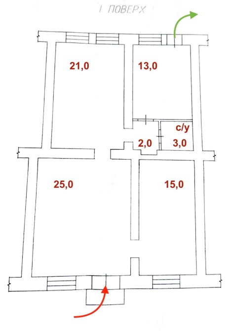 4 помещения (25+21+15+13)м, с/узел,