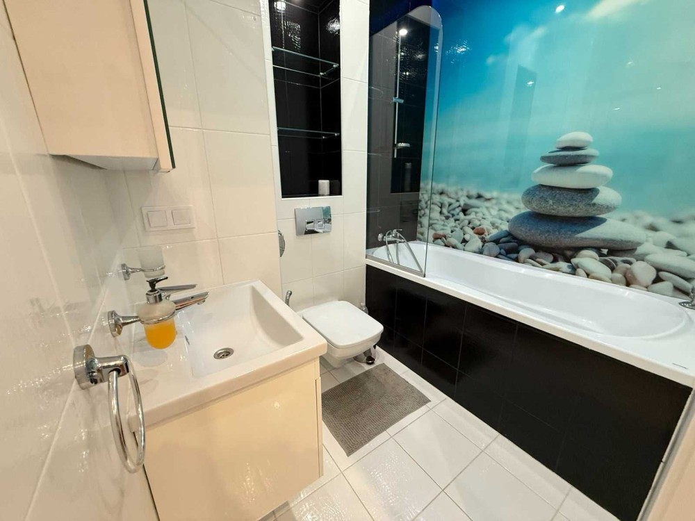 Второй — совмещённый с ванной, с инсталляцией, гигиеническим душем, стильной сантехникой ROVAK и качественными смесителями.