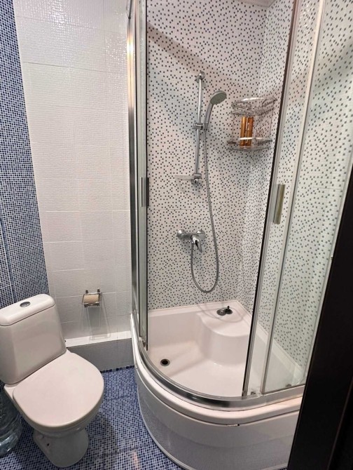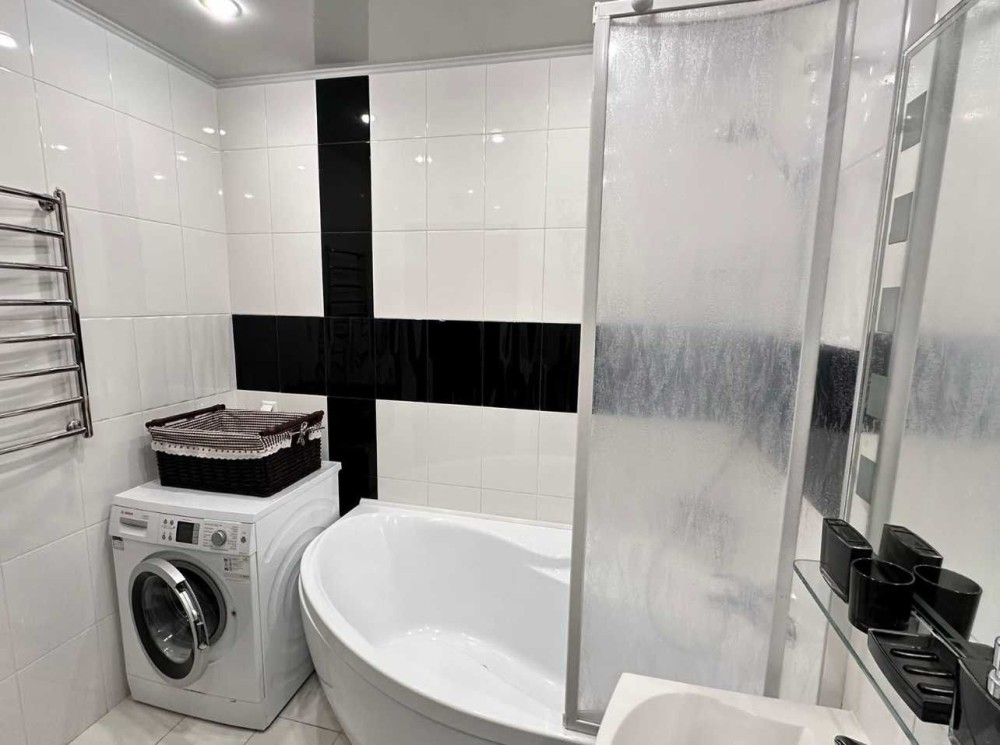 Электро плита, тёплый пол, в каждой комнате кондиционер, 2 санузла - один с угловой ванной и другой с душ кабиной.