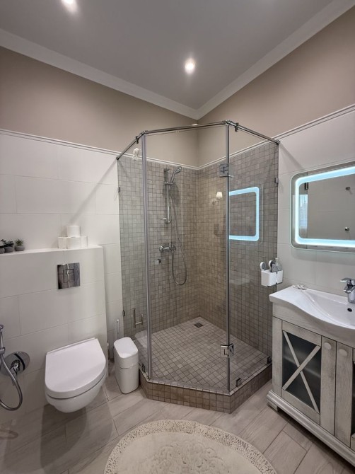 • Комфорт: кондиционеры (3 шт.), видеонаблюдение, подогрев полов, гардероб, душевая кабина, детская кроватка, двуспальная кровать, парковочное место, охраняемая территория