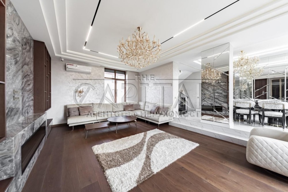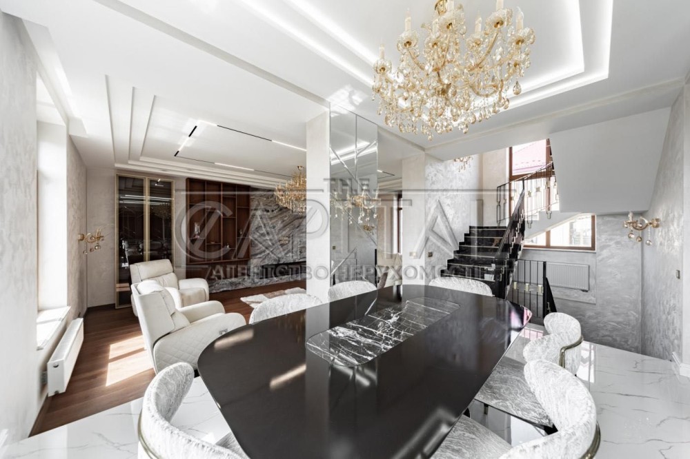 Перший поверх - хол, кухня AYAX (кварц натуральний),техніка Miele, їдальня (меблі NE STANDART та GABBA), камінна зала (електричний камін) з меблями BLANCHE, санвузол, тераса.