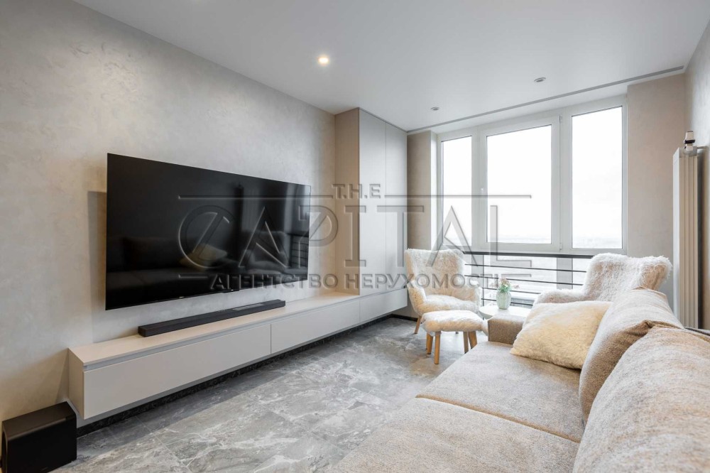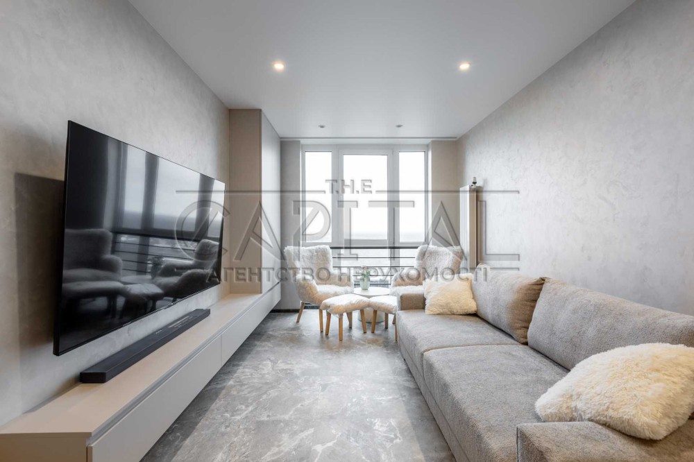 Телевізор 75” + саундбар, диван 200х220, лаунж-зона з двома кріслами.