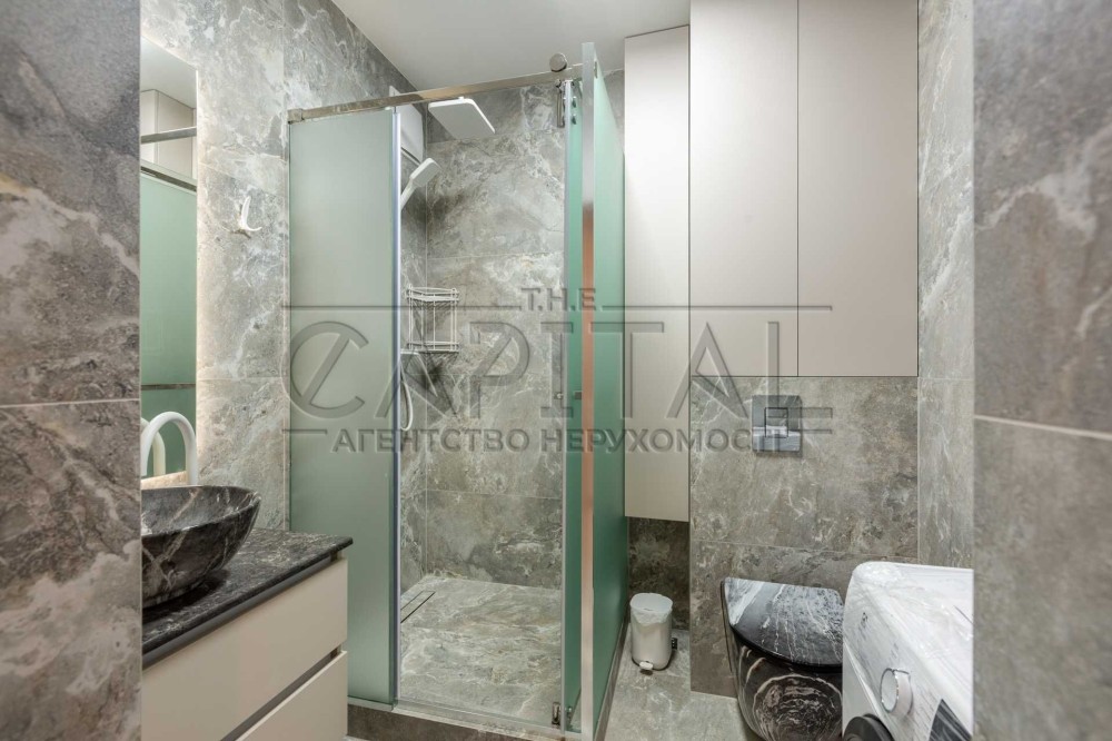 Простора душова зона, дизайнерська сантехніка, пральна машина, бойлер 80 л (схований в шафі).