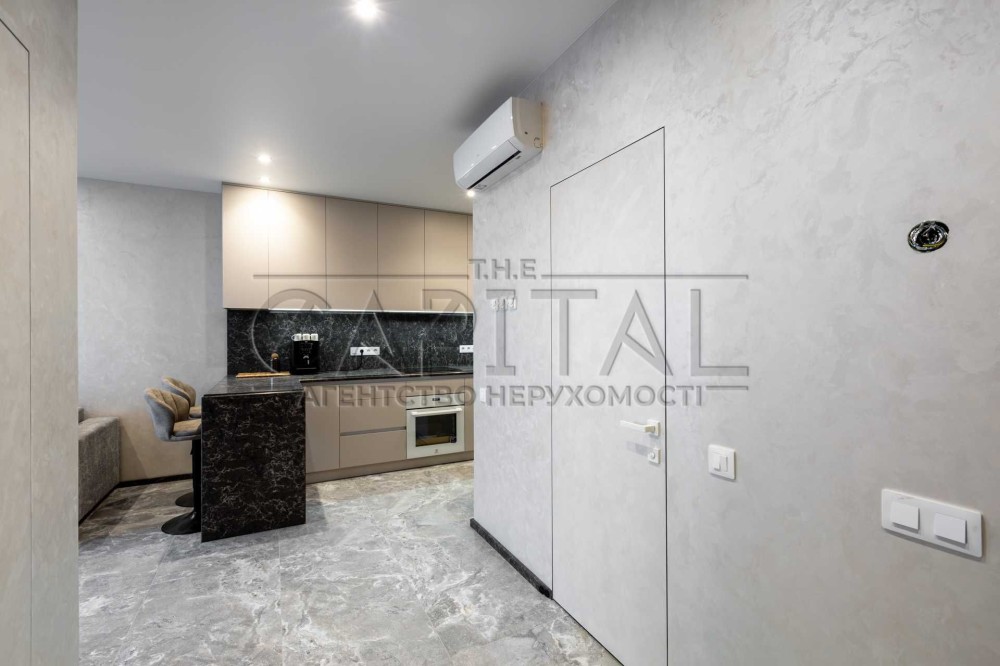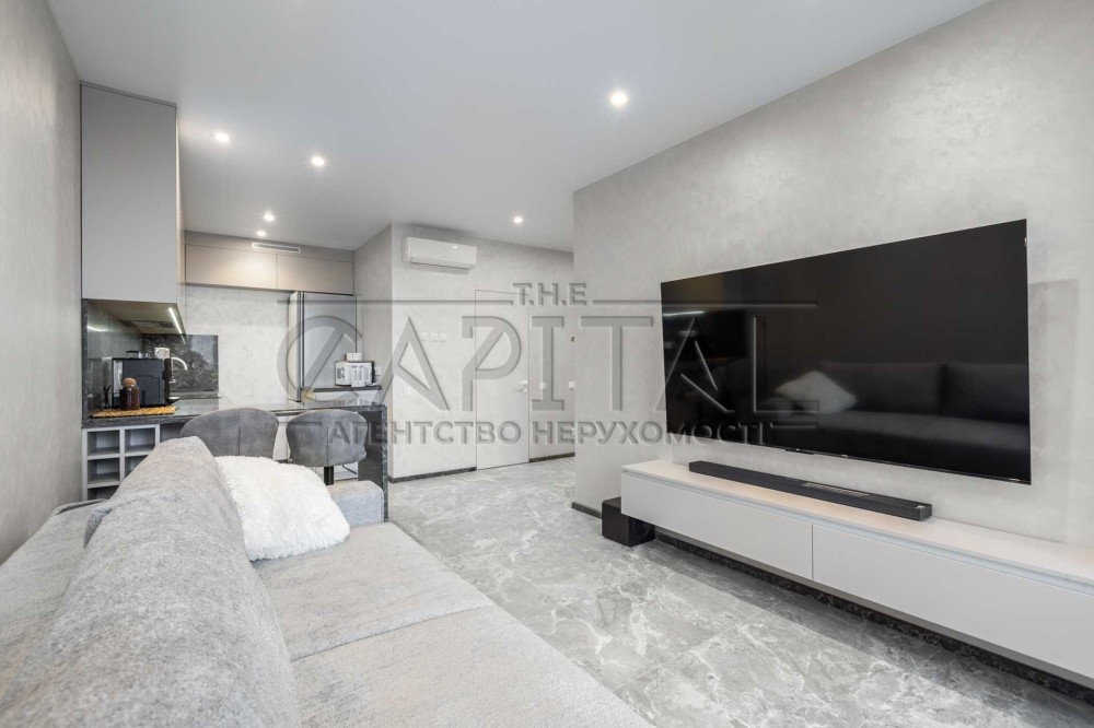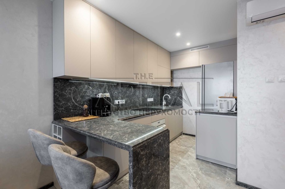 Кам’яна стільниця, барна зона, вбудована техніка преміум-класу (холодильник, посудомийна, духова шафа, кавомашина, сушильна машина, індукційна плита, мікрохвильовка).