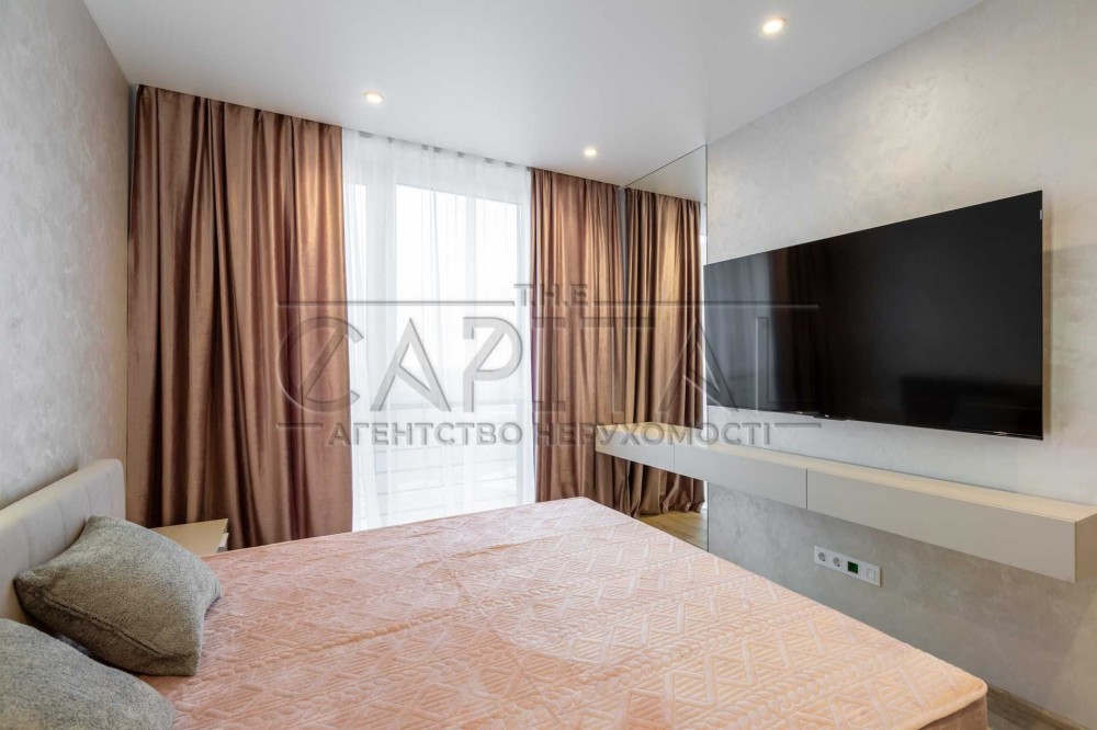 Ліжко 180х200, панно з підсвічуванням, шафа, телевізор 65”, будуарний куточок із дзеркалом у підлогу.