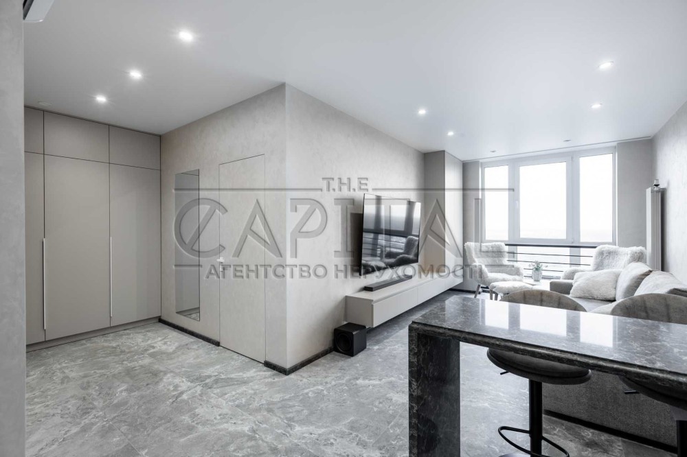 Світлі тони, венеціанська штукатурка, двері скритого монтажу, кам'яні поверхні та дизайнерські меблі створюють атмосферу спокою та елегантності.
