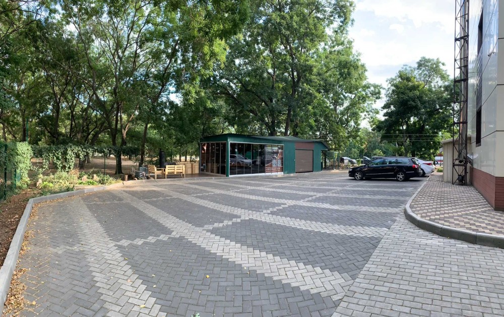 -На территорию два въезда, парковка, беседка, озеленение.