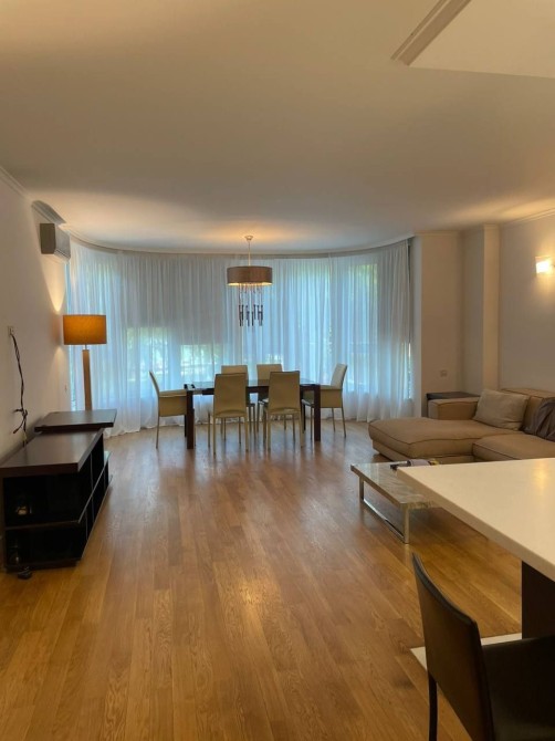 зону кухні/студії з обіднім столом та зону вітальню з диваном, кріслами та ТВ панеллю + три окремі спальні + два санвузли один з душовою кабіною, інший з ванною та теплими підлогами + окрема пральна;