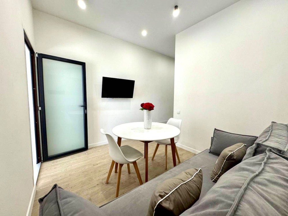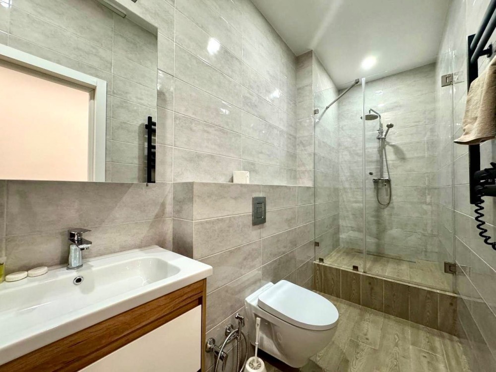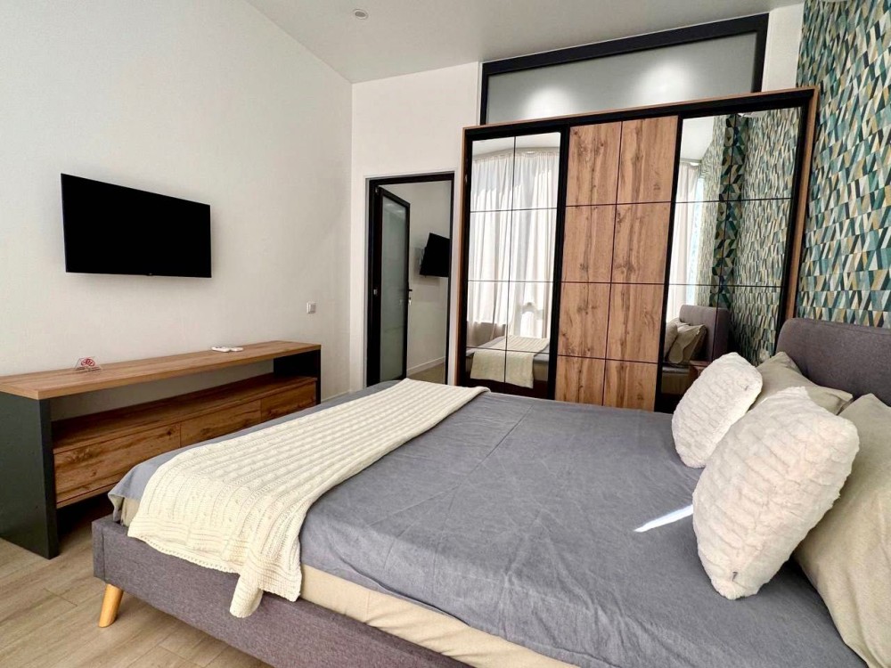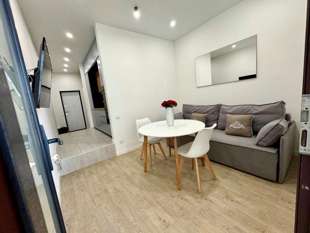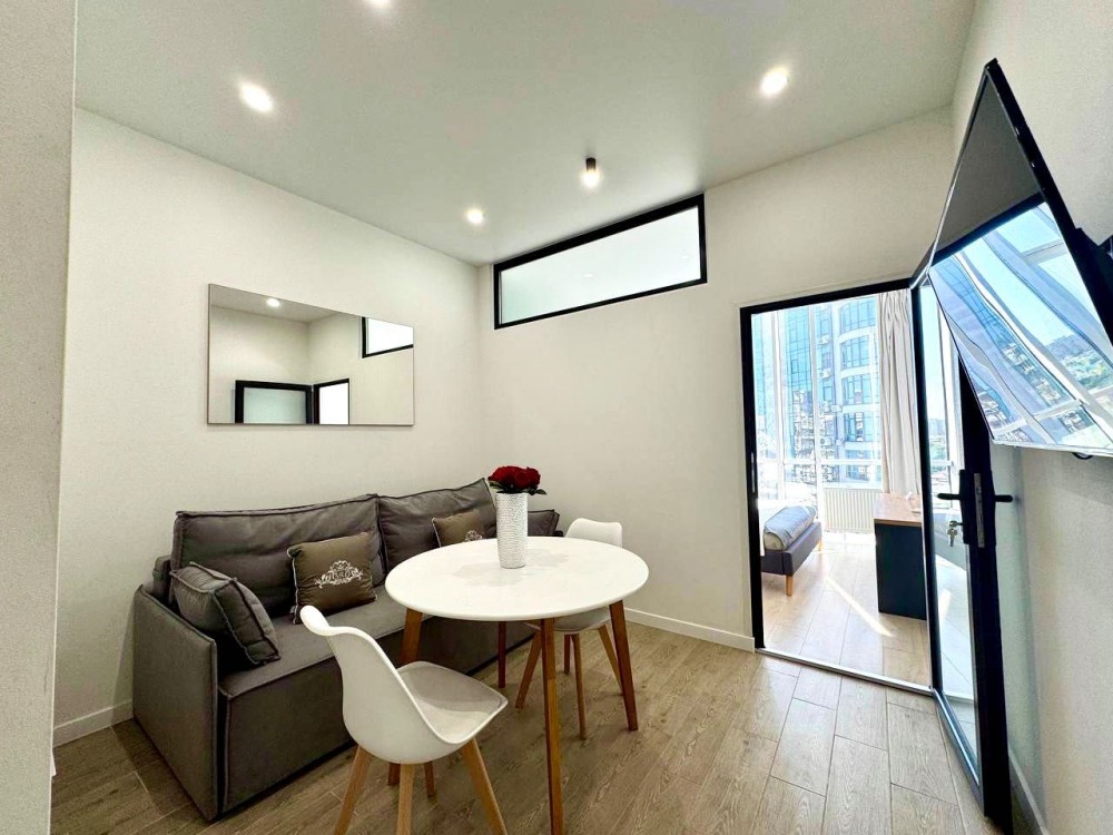 Единое студийное пространство гостиной с кухней, удобная и вместительная обеденная зона с большим столом и стульями, в каждой комнате ЖК телевизор на стене. В ванной комнате апартаментов — вместительная душевая кабина.