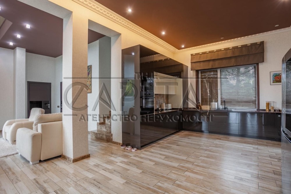 Кухня, вітальня з каміном і високими стелями що надає свій вишук, велика обідня зона, окремо гостьова можна зробити під кінозал, санвузол гостьовий, пральня, гардеробна та тих. частина