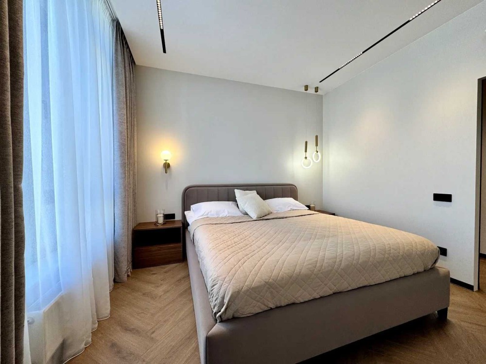 М’які меблі та ліжко Delawega, матрац Magniflex. Вбудована техніка Bosch: холодильник, посудомийна машина, варильна поверхня, духова шафа, мікрохвильова, пральна та сушильна машини. Телевізор Samsung, домофон Hikvision. Тепле багатосценарне освітлення.