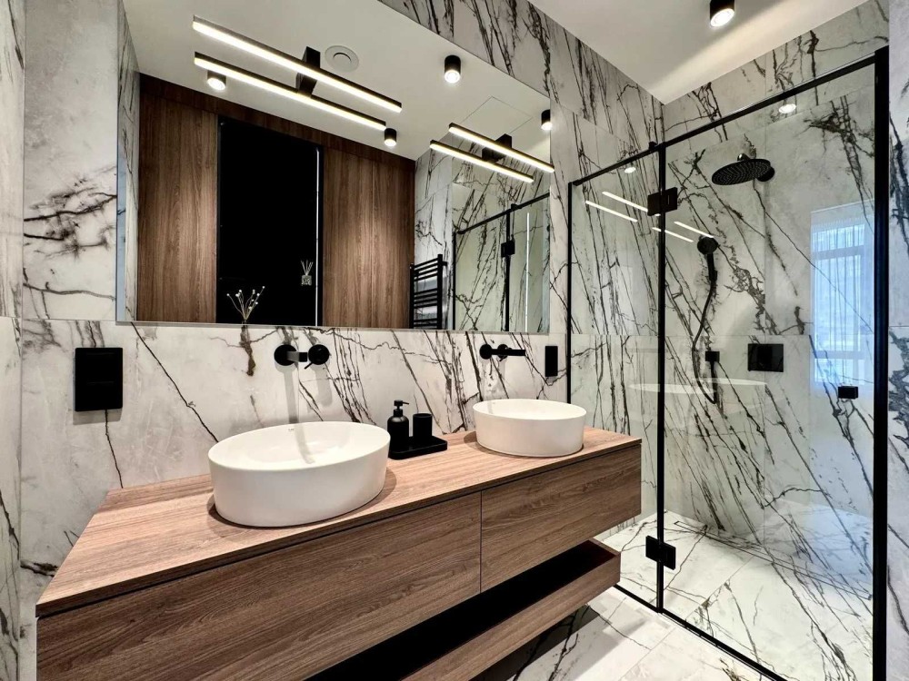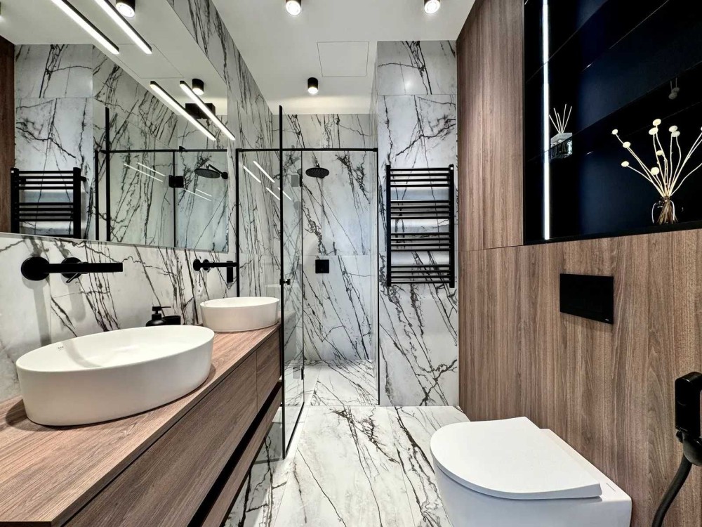 Квартира повністю укомплектована преміальними матеріалами та технікою: кондиціонери Daikin, сантехніка Hansgrohe, Villeroy and Boch, Kerasan, Geberit, RAK Ceramics, TECE, Terma, Blanco; фільтр зворотного осмосу Leader; електрощити та автоматика Hager, електрофурнітура Jung; інвертор EcoFlow; магнітні трекові системи освітлення та LED-світильники.