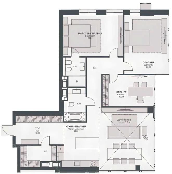 Планування створене для комфорту щоденного життя: передпокій з великим дзеркалом, ванна кімната з душовою, дуже простора кухня-вітальня, велика спальня з робочою зоною та додатковою гардеробною.