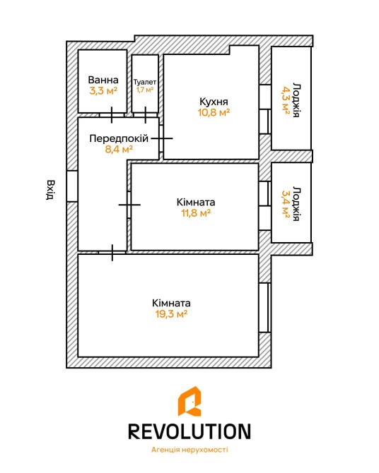Загальна площа 64,6 м² (житлова 43,7 м², кухня 6,8 м²)