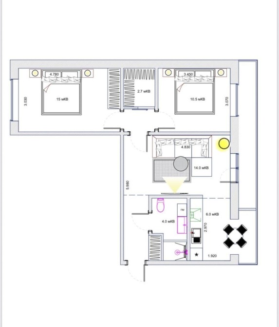 Квартира легко переплановується. Отримаєте залу-кухню, + велика гардеробна + 2 спальні.