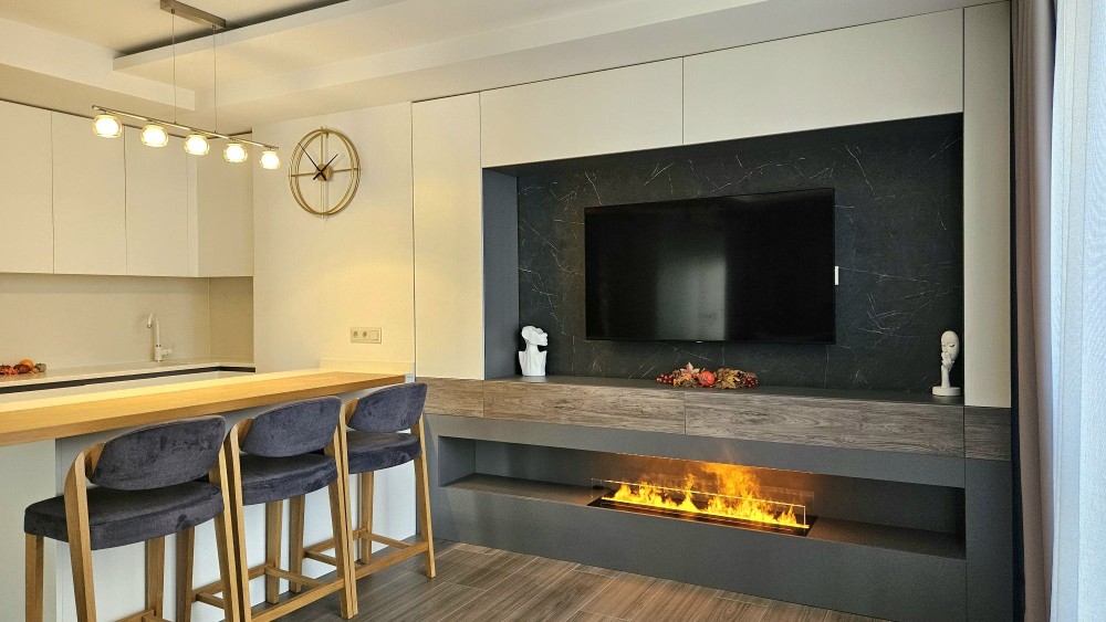 * простора кухня-вітальня з каміном для затишних вечорів;