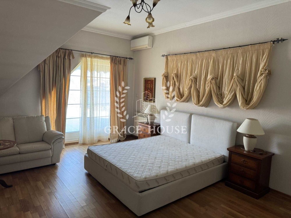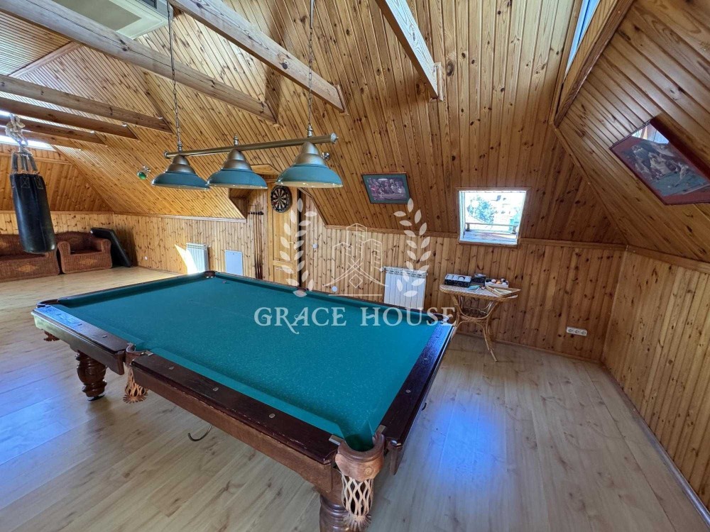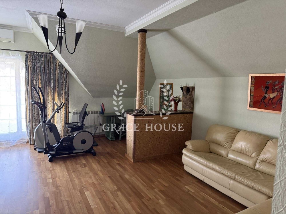 Дом общей площадью 500 м. кв., три этажа. Планировочное решение - 4 спальни, 5 с/у, тренажерный зал, бассейн с отдельным входом с участка, просторные террасы с панорамным видом, кухня, гостиная с камином, столовая.